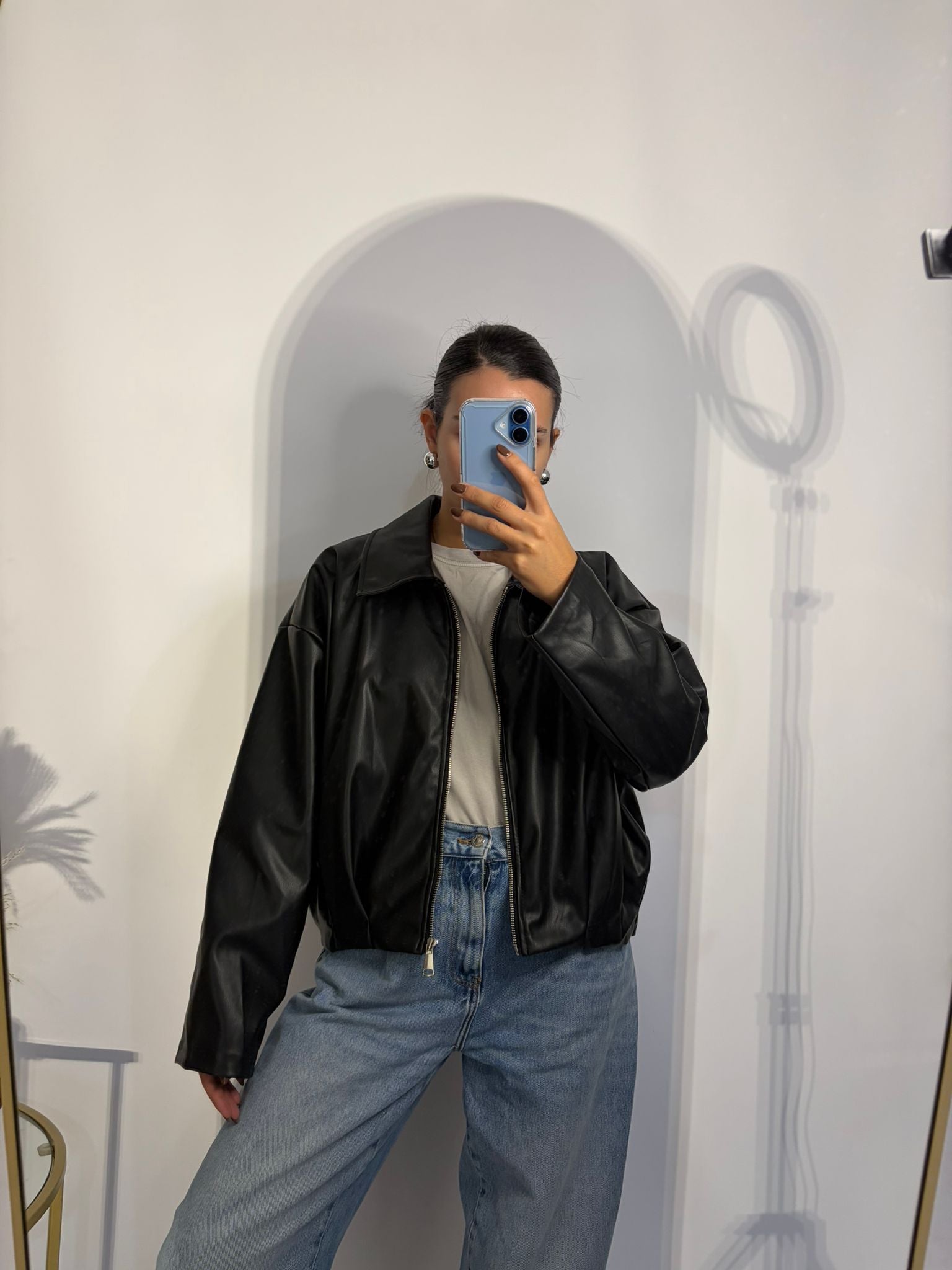 Bomber polipiel. Cuello solapa y manga larga con hombro caído. Bajo acabado con pliegues y cierre frontal con cremallera. Talla única (XS-M)