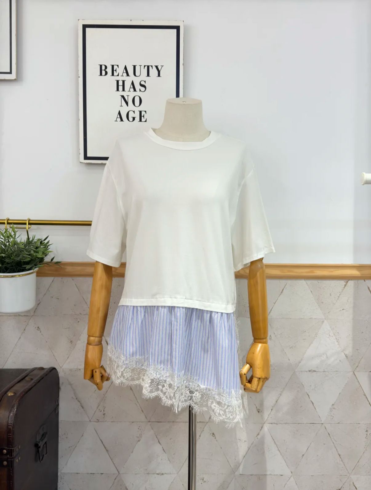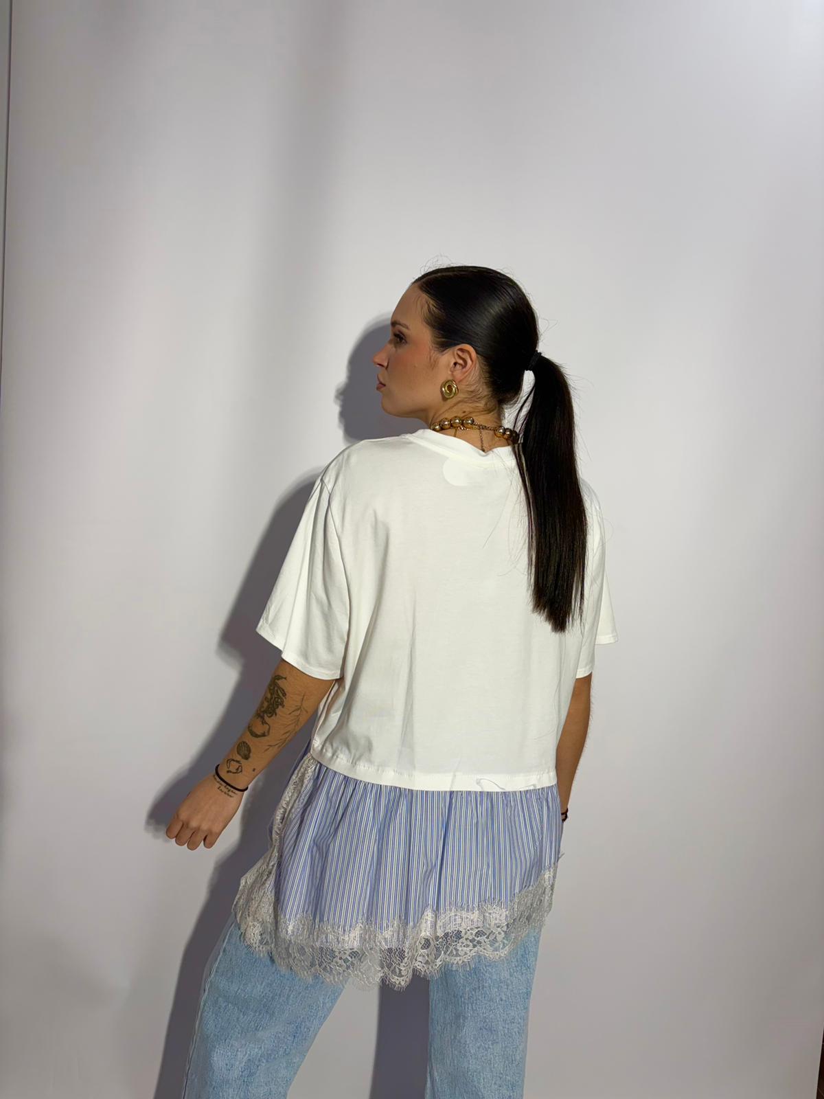 Camiseta de corte oversize , cuello redondo y manga corta amplia. Bajo superpuesto en tejido a contraste con detalle de encaje. TALLA ÚNICA (S-M-L)