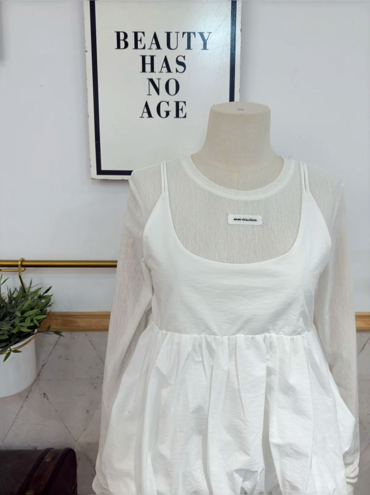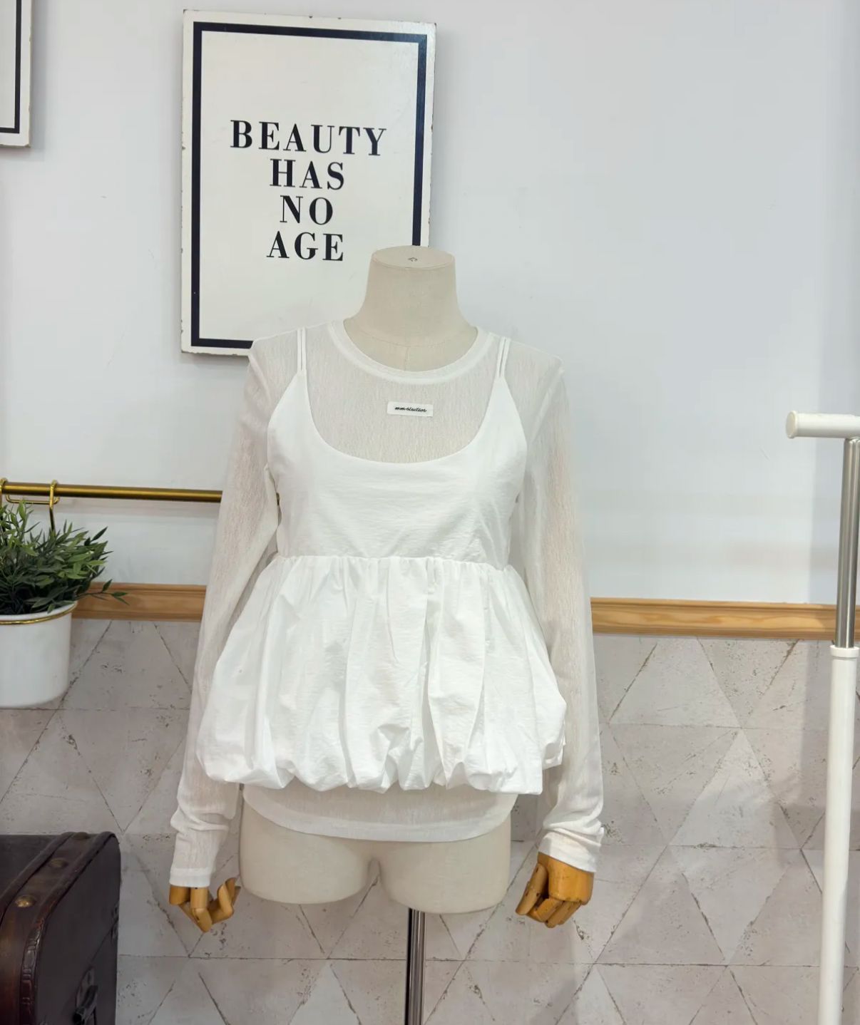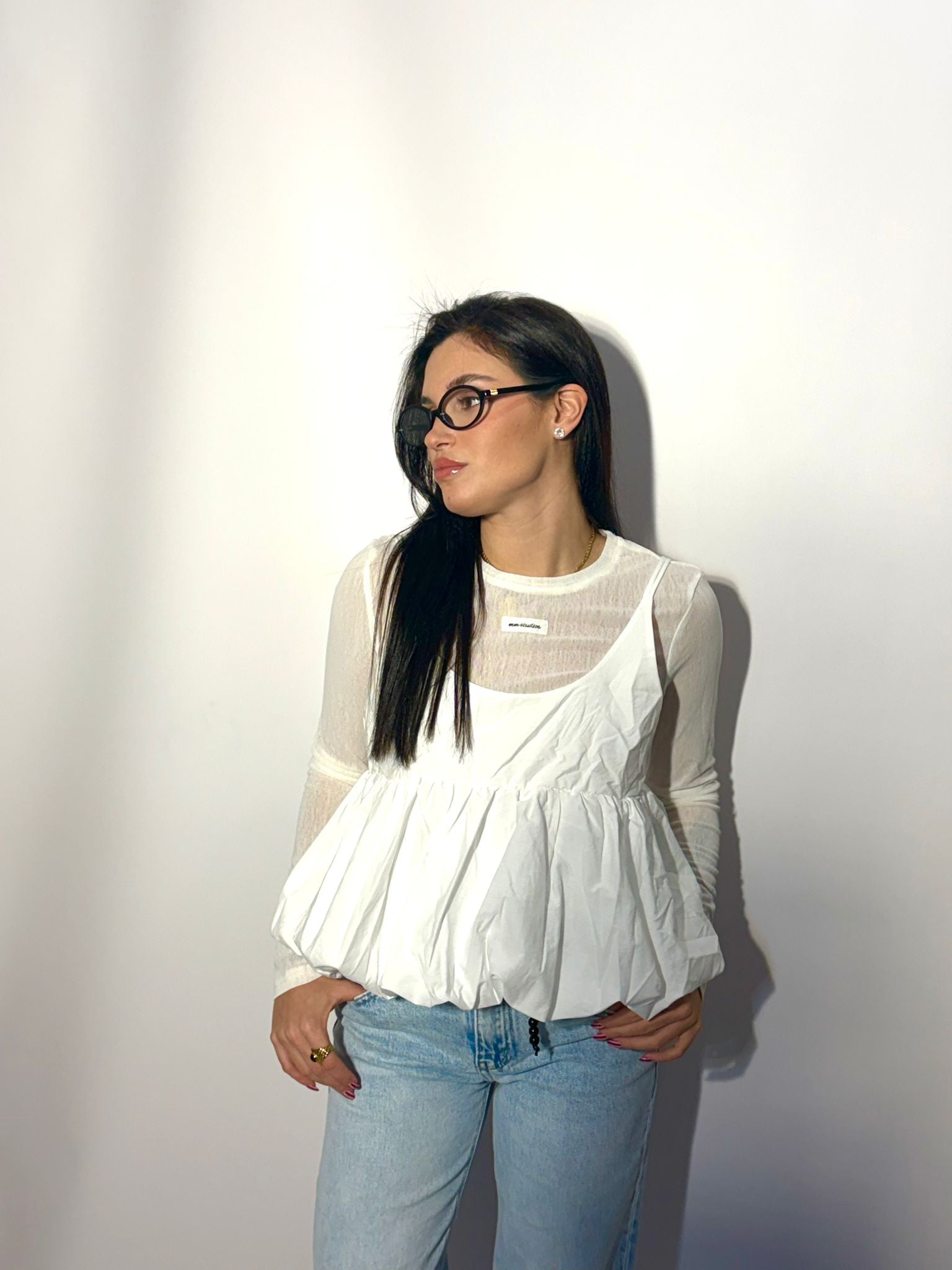 Camisa combinada compuesta de camiseta de hilatura fina en interior y camisa de popelín con bajo abullonado con elástico interior y tirante fino.
