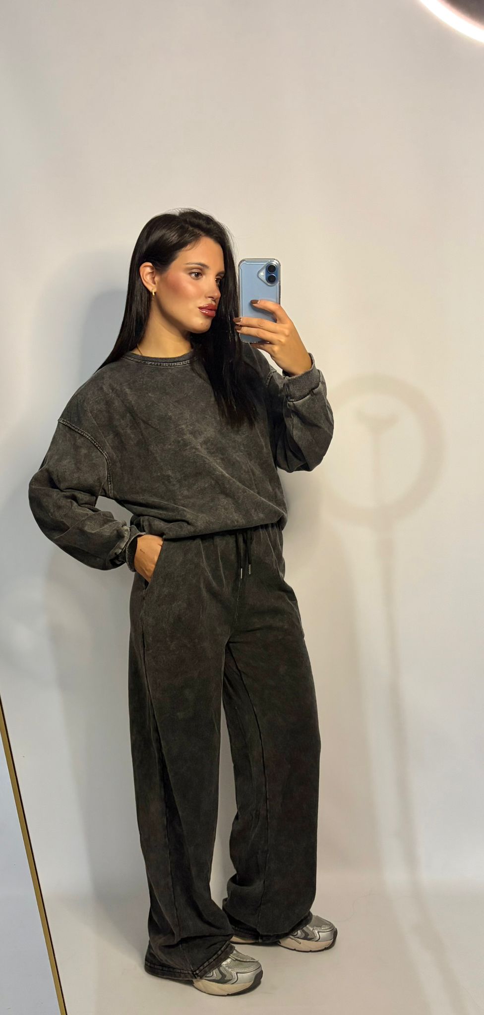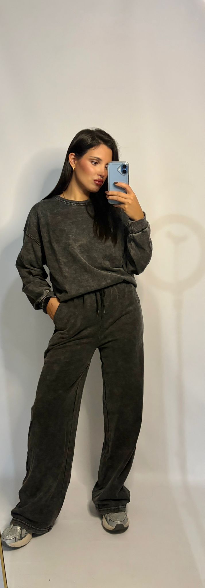 Conjunto de chándal con efecto lavado. Pantalón tiro alto con cinturilla ajustable con cordones y bolsillos laterales. Sudadera básica.