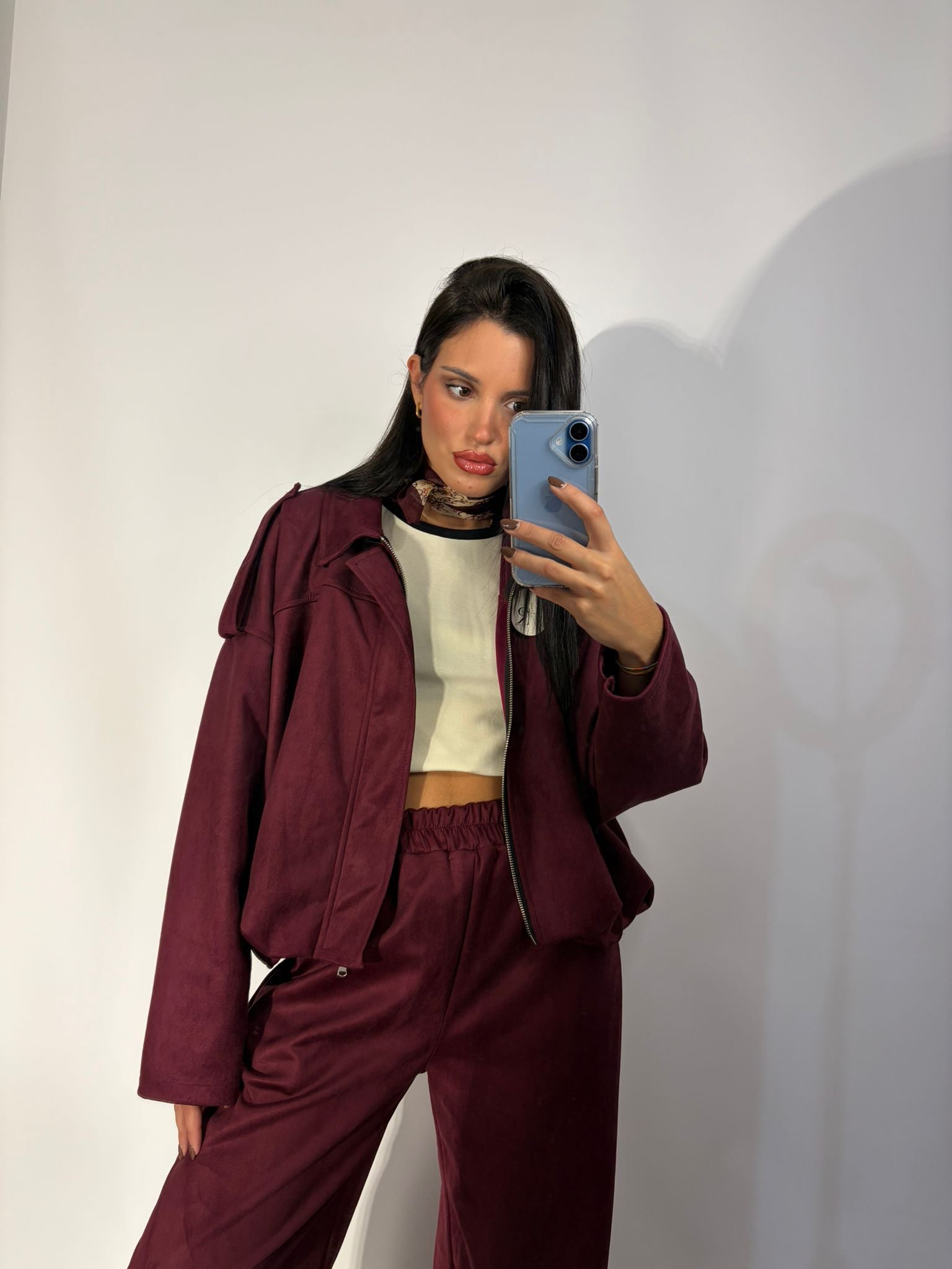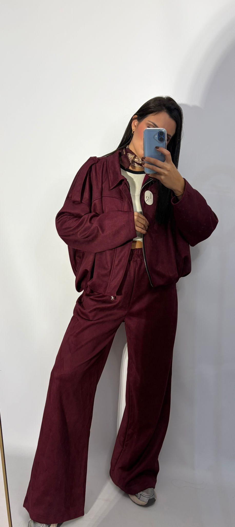 Conjunto ante. Pantalón con gomilla en cintura. Chaqueta bomber de cuello solapa y manga larga con trabilla en hombro. Bajo acabado en pliegues y volumen. Cierre frontal con cremallera oculta por solapa. Talla única desde S hasta XL.