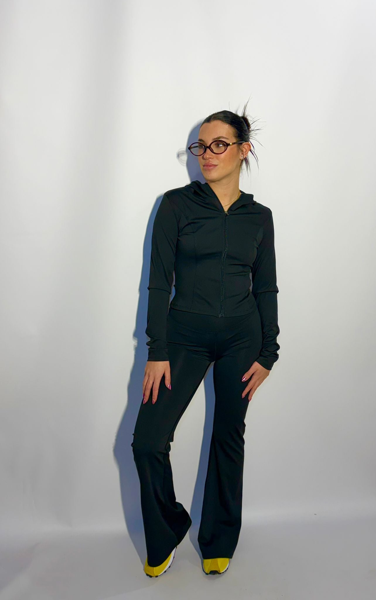 Conjunto deportivo compuesto de chaqueta técnica y leggins reductores terminados en campana a conjunto.