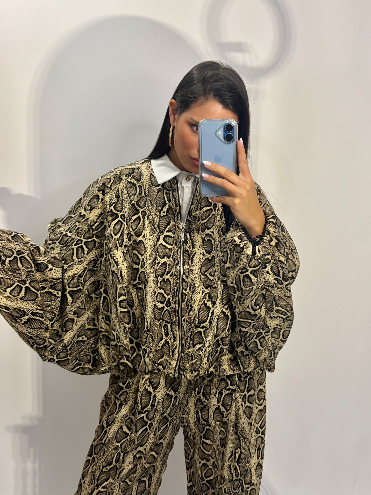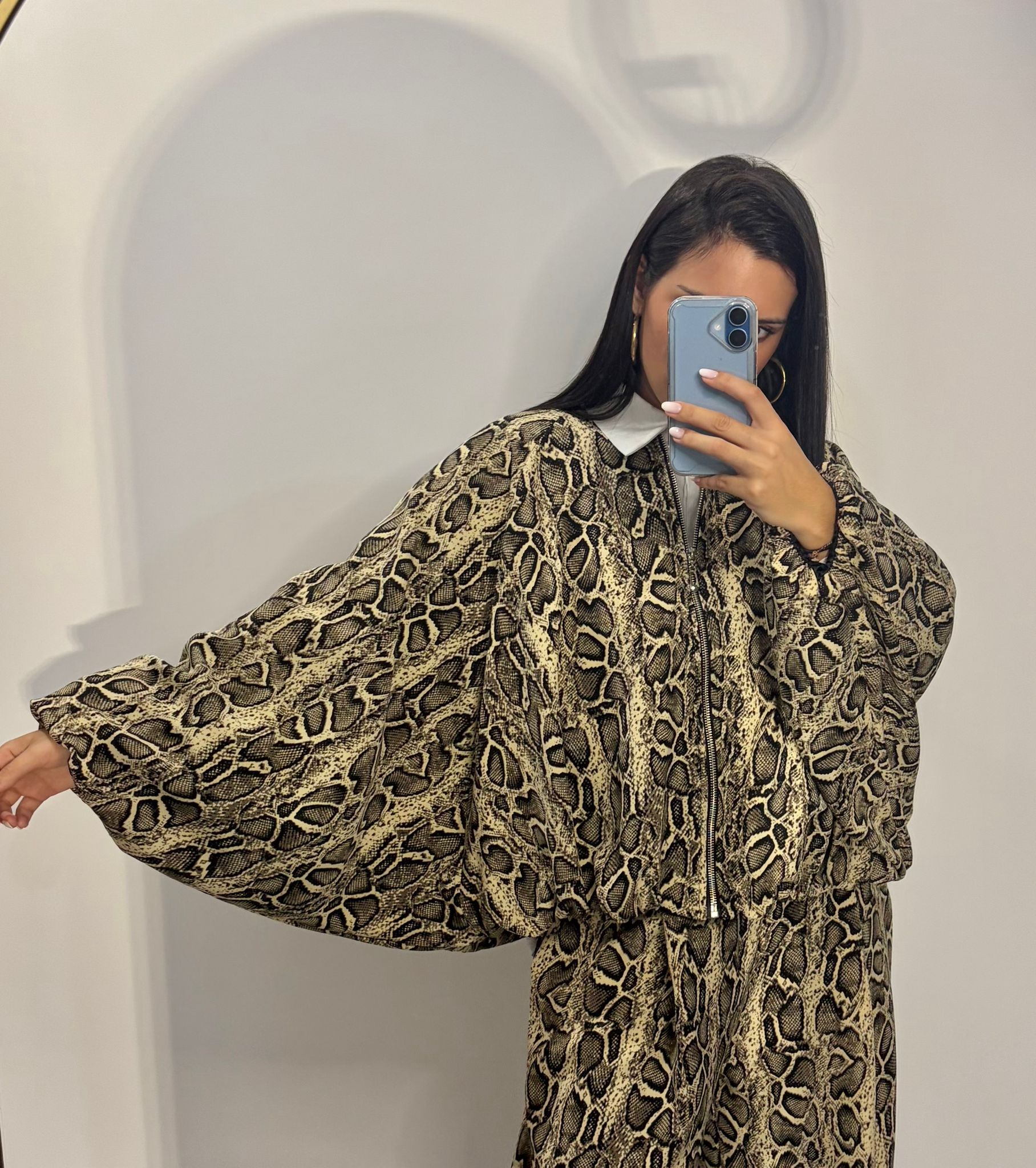 Traje animal print compuesto de bomber y pantalón ballon. Bomber con manga murciélago , bajo acabado en pliegues y cierre frontal con cremallera metálica. Pantalón tipo ballon , bajo abullonado y cinturilla elástica. Talla única ( XS-XL)
